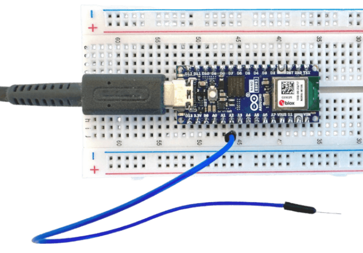 IDE가 준비되면 맨 끝/피복이 벗겨진 "점퍼 케이블"을 개발 보드에 추가하여 터치 기능을 테스트합니다. 이제 코드로 넘어가겠습니다!