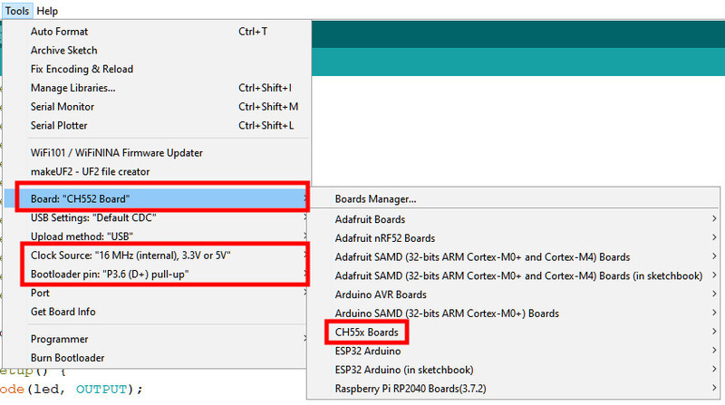 도구 → 보드 하위 메뉴에서 CH55x 보드를 볼 수 있으며 해당 드롭다운에 CH55x 보드가 포함되어 있어야 합니다.