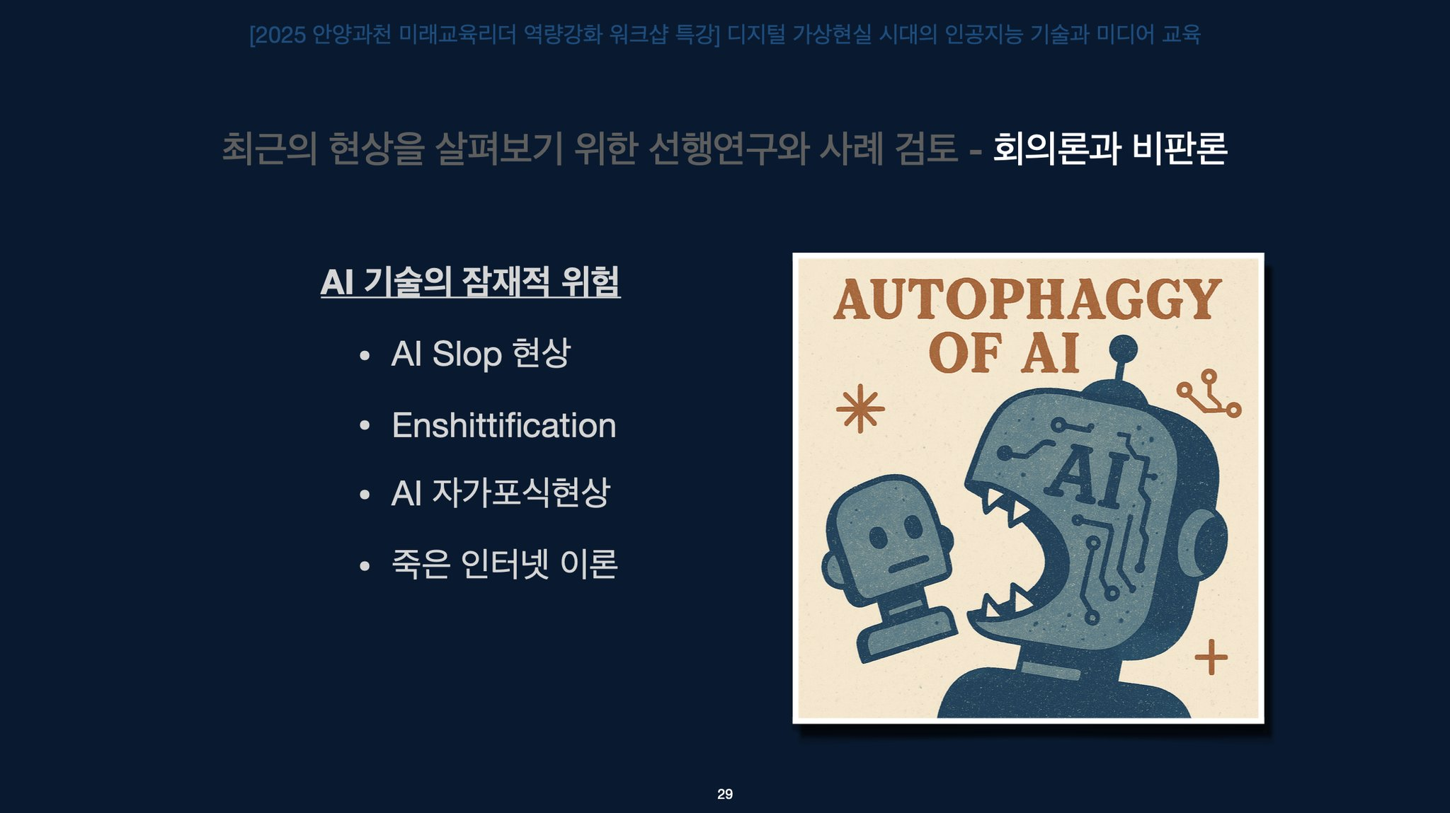 | AI 자가포식 | AI가 AI 콘텐츠를 학습해 품질 저하 | AI 콘텐츠의 범람 | 반복적이고 평범한 AI 출력물 |