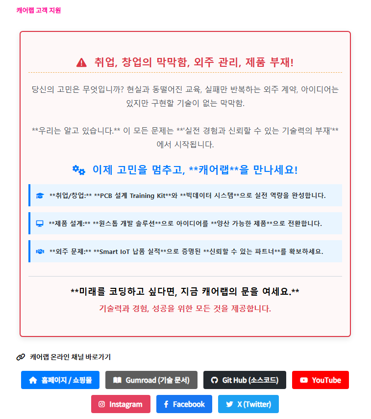 **취업/창업:** **PCB 설계 Training Kit**와 **빅데이터 시스템**으로 실전 역량을 완성합니다.