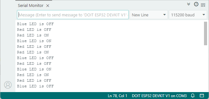 두 개의 서로 다른 LED 상태를 보여주는 직렬 모니터 - ESP32를 사용하여 여러 FreeRTOS 타이머 테스트