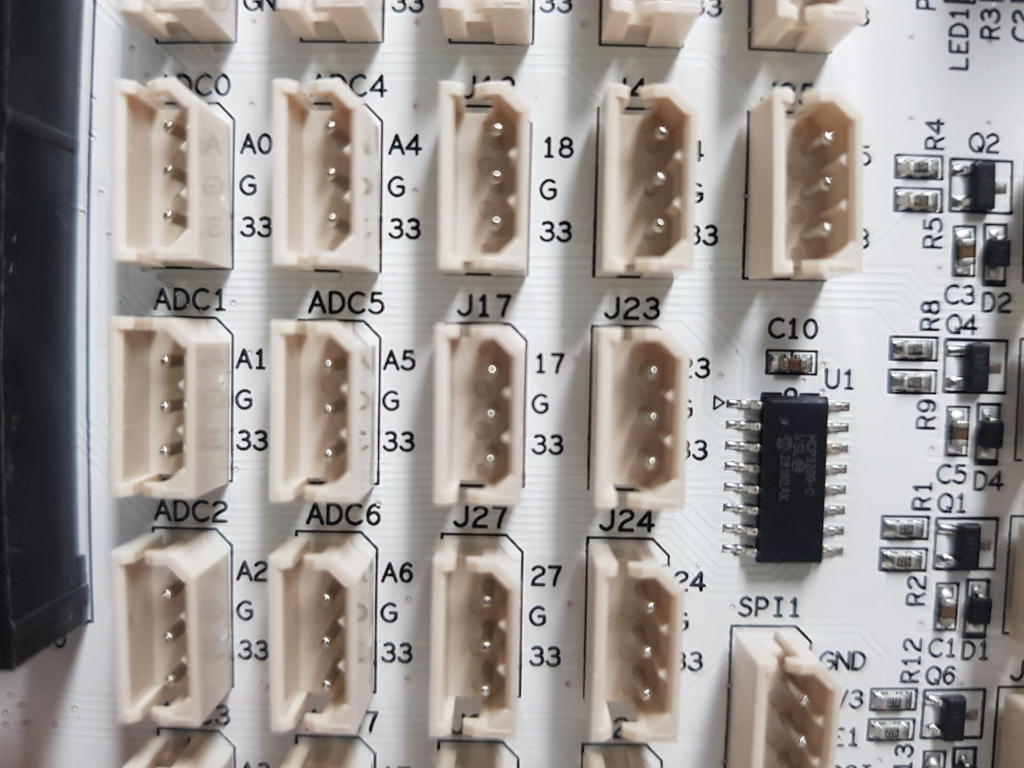 보드의 장점은 보드의 커넥터와 출력 핀 넘버가 직관적이라는 사실이다. 아래 이미지를 보면 ADC0~ADC7 까지는 ADC 채널을 의미하고, 커넥터 번호는 BCM 번호(라즈베리파이 정식 핀 번호)를 의미한다. 파이선을 이용해 코딩할 때는 즉시 번호를 사용하여 제어하고, C 언어를 사용할 때는 $gpio readall 명령을 사용해 BCM 번호를 찾아 wiringPi 핀 번호를 찾아 코딩하면 된다.