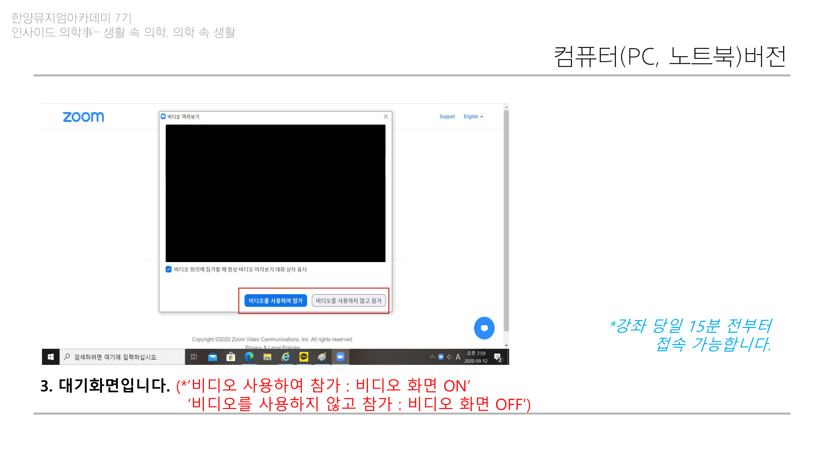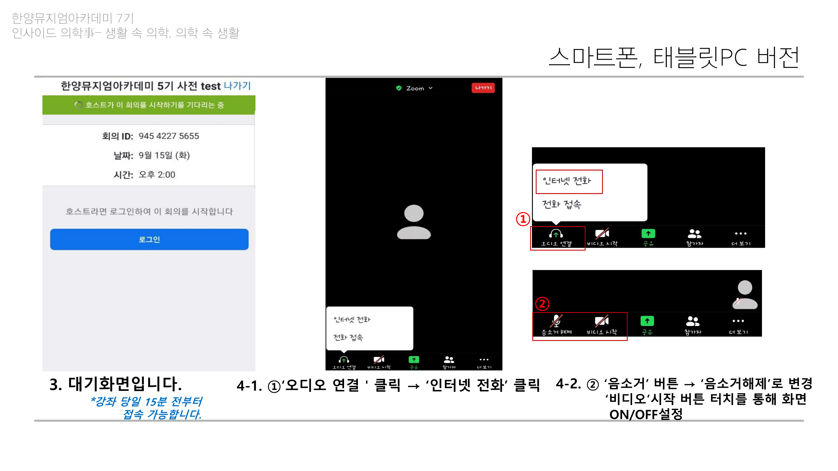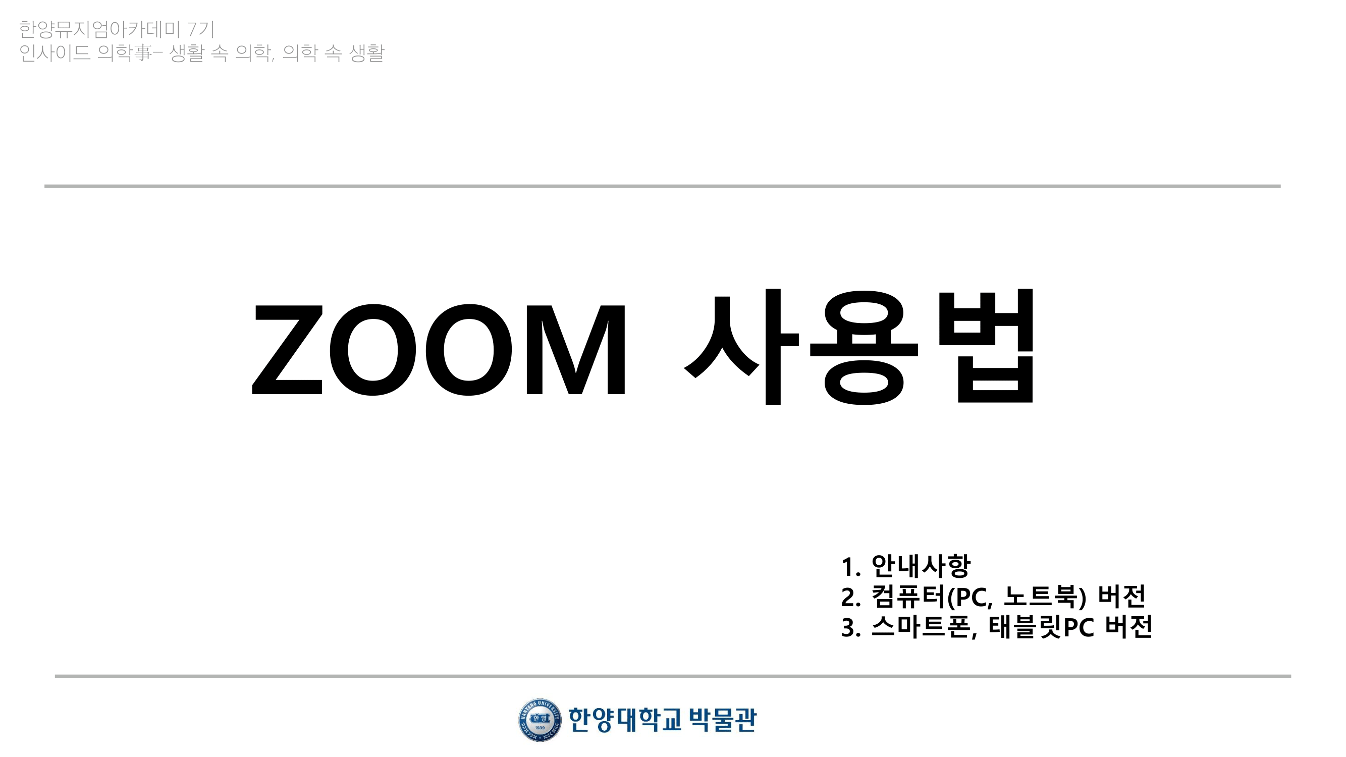 코로나19 상황에 따라 ZOOM플랫폼을 통한 실시간 화상강연 방식으로 진행됩니다. 이번 아카데미 7기 관련 ZOOM사용법을 첨부해드립니다.
