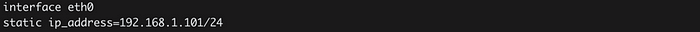Pis에 설정한 정적 ip_address는 라우터의 ip_address와 일치해야 한다는 점에 유의하세요. 예를 들어 라우터의 ip_address는 192.168.1.10X/24에서 시작하므로 각 Pi에 아래에 표시된 ip_address를 할당합니다.