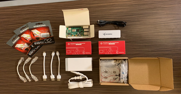 위의 그림은 저희가 구매한 구성품을 보여줍니다: Raspberry Pi 4 *3, SD 카드 *3, 인터넷 케이블 *3, 충전 케이블 *3, 스위치 *1