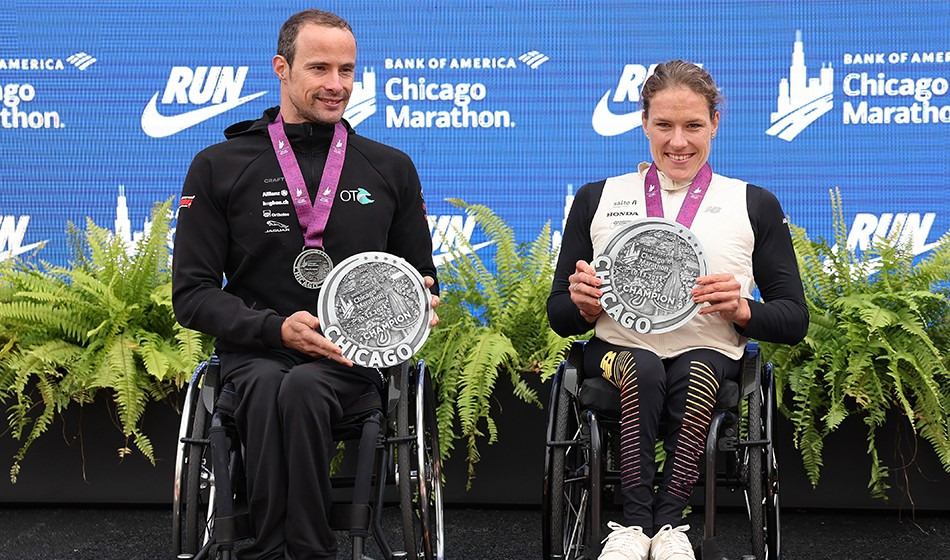 패럴림픽에서 6회, 세계 금메달 5개를 딴 캐서린 드브루너는 시카고에서 1:36:12를 기록하며 1:38:44의 자신의 기록을 깨고 더블 스위스 포디엄을 차지했습니다.