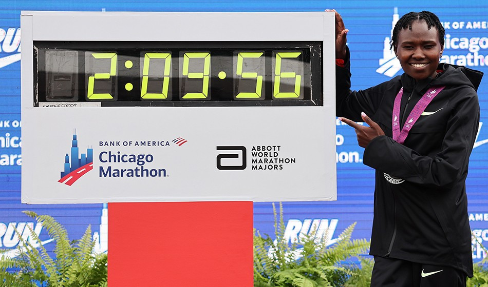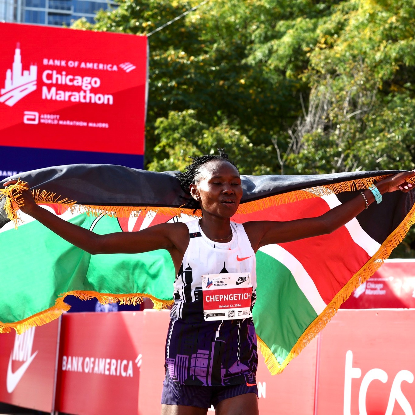 올해 시카고 마라톤에서 코스게이의 2:14:04로부터 5년 후, 케냐의 루스 체프네티치가 2:09:56의 기록으로 기록을 다시 썼습니다.