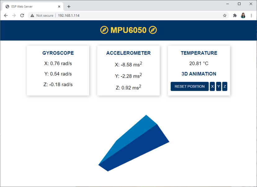 센서를 움직여 보면 측정값과 브라우저의 3D 객체가 어떻게 변하는지 확인할 수 있습니다.