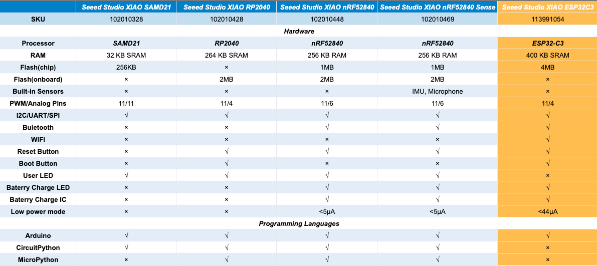 - 작고 정교한 Seeed Studio XIAO 시리즈 클래식 폼 팩터를 유지하면서 2.4GHz Wi-Fi 및 BLE(Bluetooth Low Energy) 무선 기능을 제공 합니다.