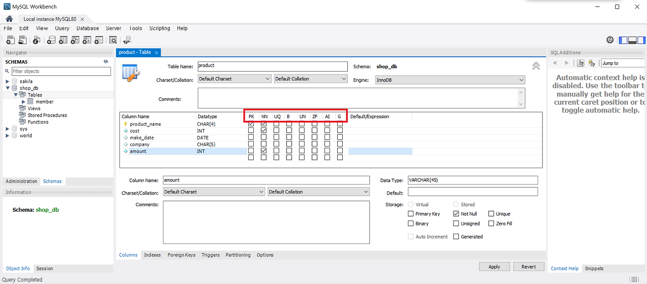 MySQL 워크벤치에서 데이터를 만들 때 열(Column)에서 PK, NN, UQ, BIN, UN, ZF, AI, Default/Expression를 볼 수 있는데, 이는 제약 조건을 의미한다. 각각 어떤 의미인지 설명하고자 한다.