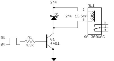"24V 신호"로 변환하는 것은 요점을 놓치고 있습니다. 진짜 문제는 5V 디지털 신호에서 24V 릴레이를 구동하는 것입니다. 다행히도 이는 쉽습니다. 한 가지 방법이 있습니다:
