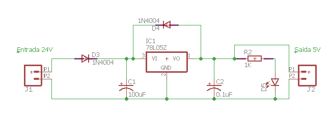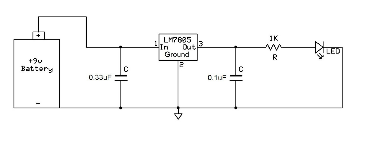 두 번째 커패시터인 0.1uF 세라믹 커패시터는 전압 조정기 다음에 연결됩니다. 이 커패시터는 DC 전압 라인에 있을 수 있는 노이즈나 고주파(교류) 신호를 필터링하기 위해 다시 연결됩니다. LED를 켜는 이와 같은 회로에서는 순수한 DC 신호가 중요하지 않지만, 올바른 로직 출력을 제공하기 위해 정확한 전압을 공급해야 하는 로직 칩에 전원을 공급하기 위한 전압 출력과 같은 다른 애플리케이션에서는 매우 중요합니다. 그렇기 때문에 처음부터 전압 레귤레이터를 제대로 연결하는 것이 좋습니다.