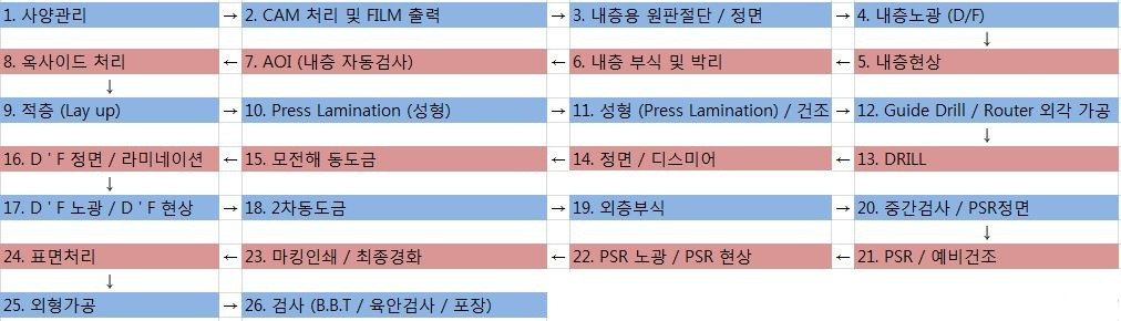 인쇄회로기판(PCB)의 작업 공정에 대해 알아보도록 하겠습니다. 인쇄회로기판(PCB)를 만들기 위해선 총 26가지의 작업 공정을 거쳐야 여러분이 지금 사용하시고 계신 인쇄회로기판(PCB)가 완성이 됩니다. 그럼 인쇄회로기판(PCB)가 어떻게 만들어지는지 표를 보시도록 하겠습니다. PCB 작업공정표클릭 하시면 더 크게 보실 수 있습니다.