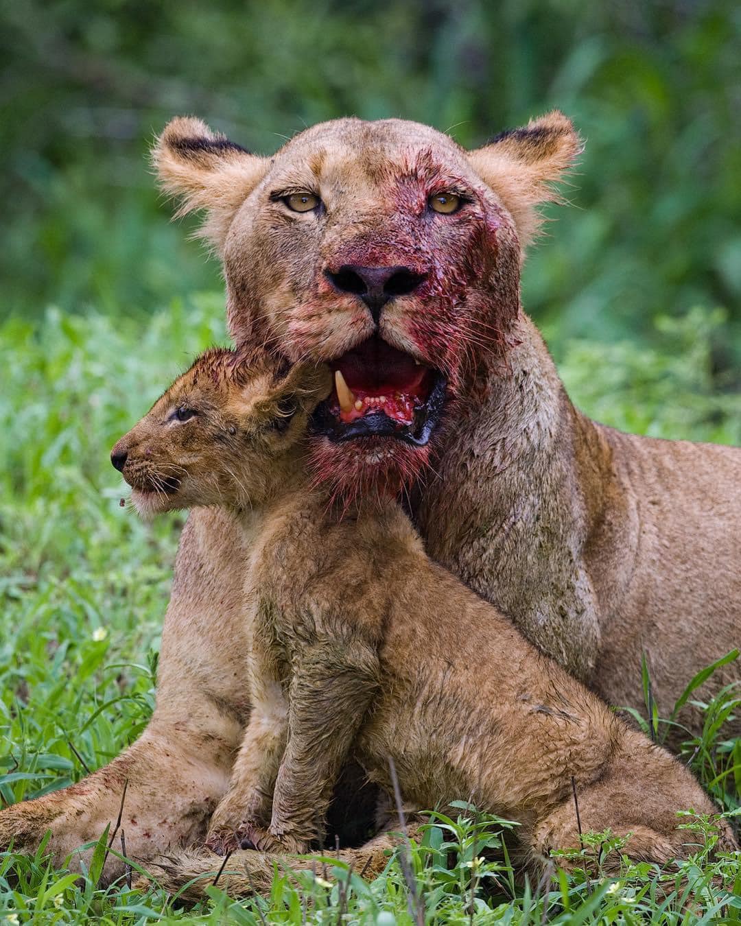 얼굴에 피가 범벅이 된 채로 새끼를 껴안고 있는 어미 사자를 보호하기 위해서였습니다.