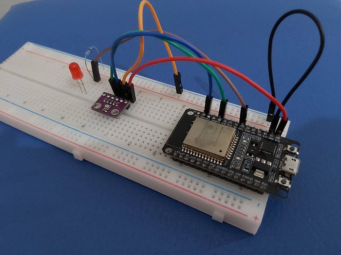 LED를 GPIO17에, BMP280 VCC를 ESP32 3V3에, BMP280 GND를 ESP32 GND에, BMP280 SCL을 GPIO22에, BMP280 SDA를 GPIO21에 연결합니다.