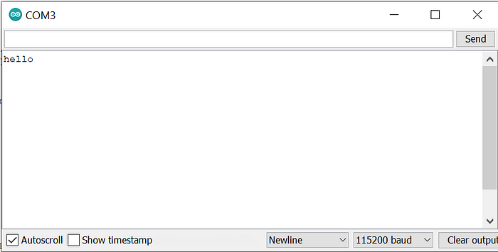 안드로이드 스마트폰의 "hello" 메시지는 Arduino IDE의 직렬 모니터에서 볼 수 있습니다. 정확한 메시지를 받을 수 있도록 올바른 보드(제 경우에는 115200 보드)를 사용해야 합니다.
