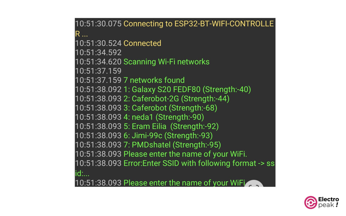 • ESP32 Bluetooth에 연결된 사용자에게 SSID와 WiFi 비밀번호를 입력하라는 메시지를 표시합니다.