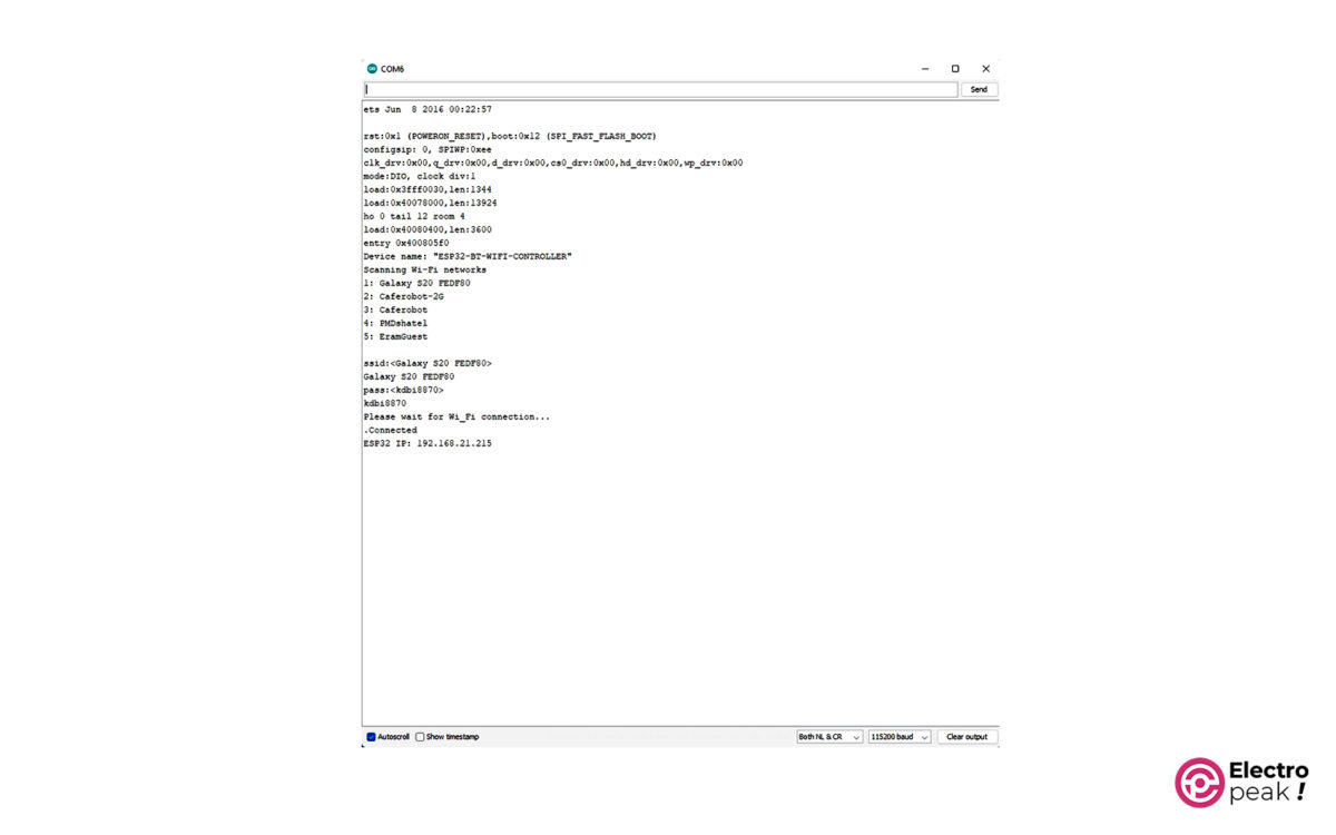 모든 단계를 올바르게 수행했다면 ESP32가 WiFi 네트워크에 연결되고 직렬 포트와 Bluetooth를 통해 IP 주소가 표시됩니다.