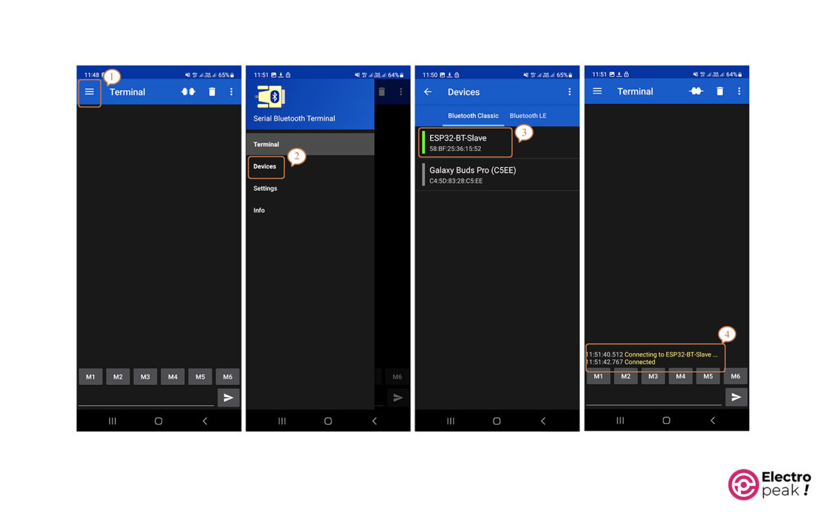 ESP32에 앱을 업로드한 후 휴대전화에서 Bluetooth를 켜고 ESP32-BT-Slave에 연결합니다. 주석 처리되지 않은 4번째 줄이 있는 경우 코드를 입력하라는 메시지가 표시되고, 연결을 설정하려면 1218이라는 숫자를 입력해야 합니다. 이제 Serial Bluetooth Terminal 앱을 실행할 차례입니다. 아래에 표시된 순서대로 1~3까지의 숫자를 탭하기만 하면 됩니다. ESP32 Bluetooth에 성공적으로 연결되면 섹션 4에 텍스트가 표시됩니다.