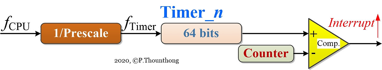 타이머는 클록 주파수와 프리스케일러 값에 따라 특정 속도로 계산하는 카운터를 사용합니다. 이 카운터는 설정 값에 도달하면 재설정되고 인터럽트를 트리거합니다. 이 카운트 값을 변경하여 타이머 간격을 변경할 수 있습니다.