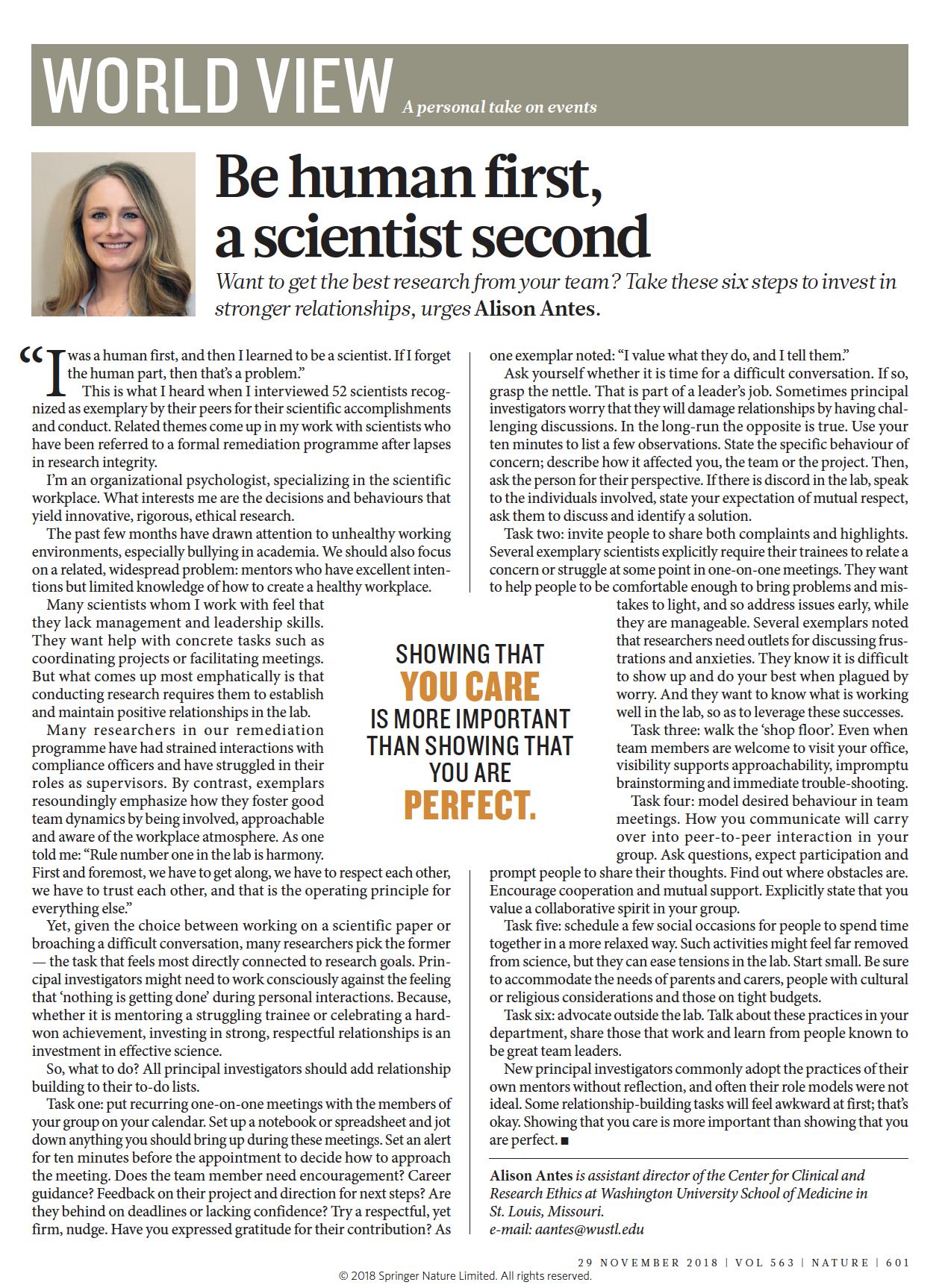 신입 연구 책임자는 일반적으로 본인의 멘토 관행을 반성 없이 그대로 받아들이는 경우가 많으며, 그들의 롤모델이 이상적이지 않은 경우가 많습니다. 인간적인 관계를 구축하는 작업은 처음에는 어색하게 느껴질 수 있지만 괜찮습니다. 자신이 완벽하다는 것을 보여주는 것보다 관심을 갖고 있다는 것을 보여주는 것이 더 중요합니다.