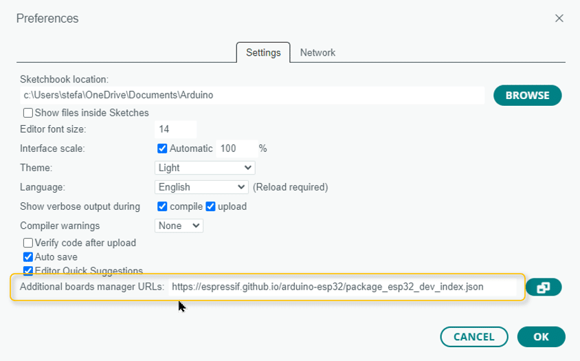 이 입력 필드에 다음 URL을 복사합니다. "https://espressif.github.io/arduino-esp32/package_esp32_dev_index.json"