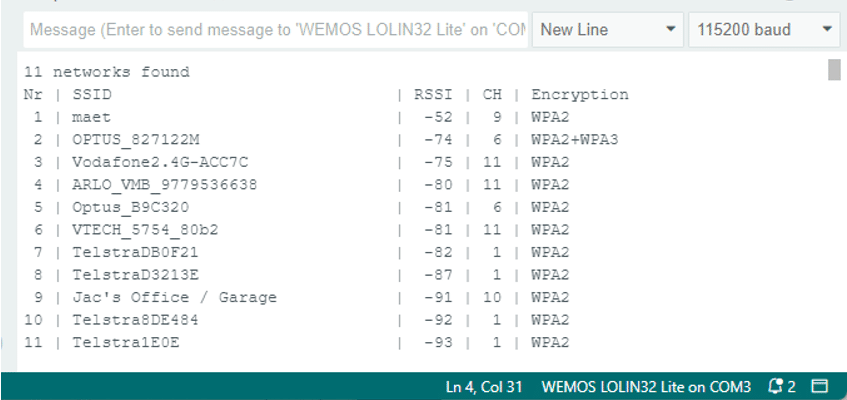 Serial.println("Nr | SSID | RSSI | CH | Encryption");