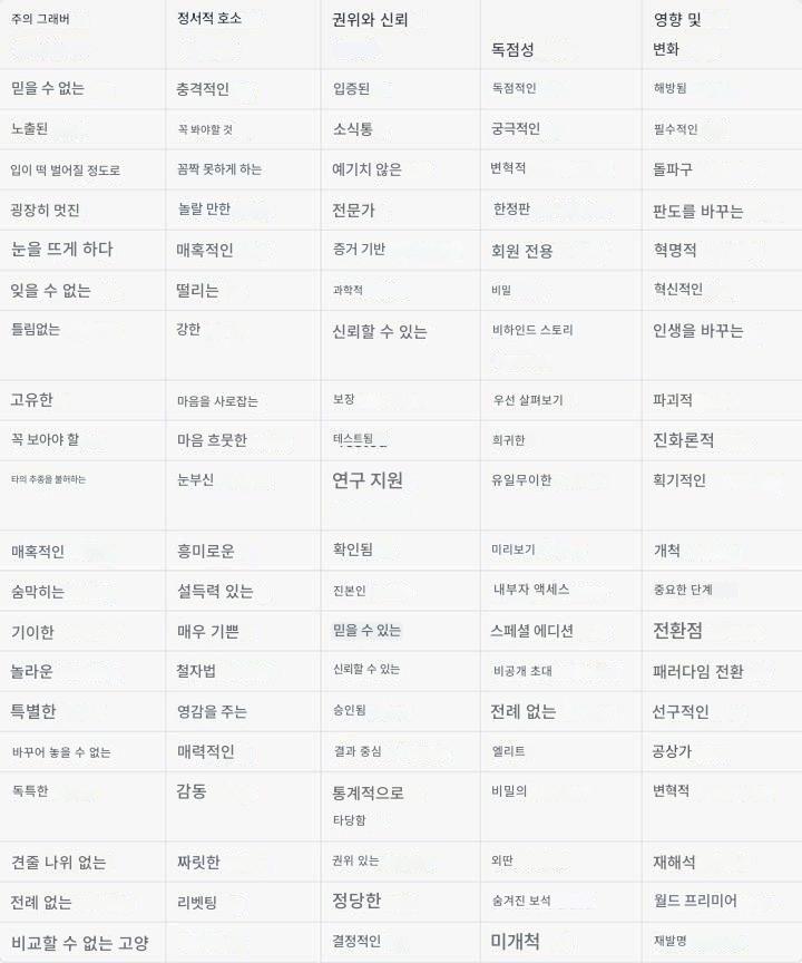 다음은 헤드라인에 사용할 수 있는 매력적인 파워단어와 문구 100개를 5개의 열로 정리한 표로, 쉽게 참조할 수 있도록 정리했습니다. 도움이 되었기를 바랍니다.