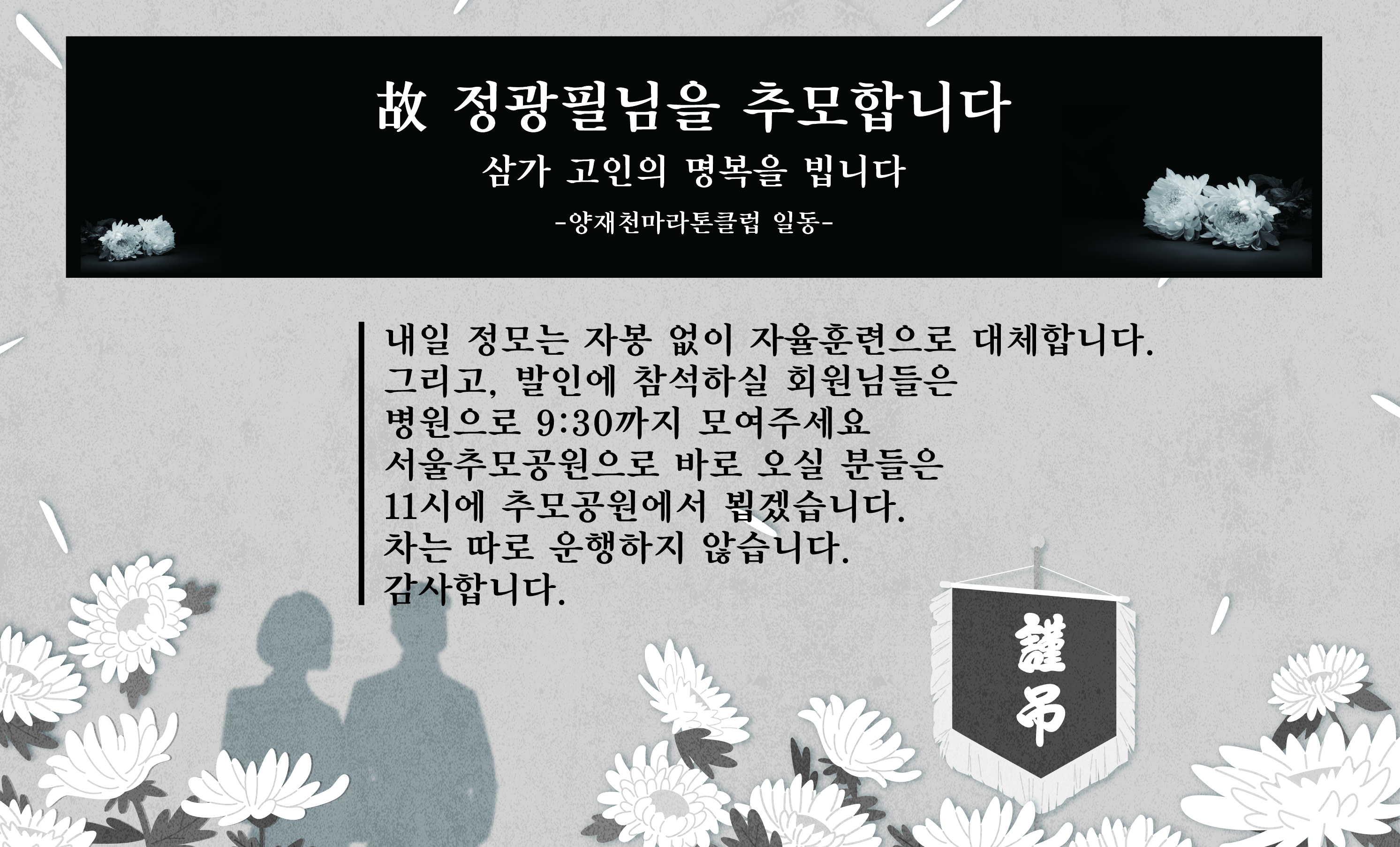 다른 사람에게 친절하고 헌신하고 돌보기를 잘하는 사람은 자신에게 잘 신경 쓰지 않는다. 만날 때마다 자기가 항상 감사하다고 말하며 환한 표정으로 너털웃음을 지었다. 그 선한 표정이 잊히지 않는다. 달리기를 시작하면서 대회가 끝나고 역삼역 뒷골목에 위치한 식당에 갔다. 그때는 마냥 좋을 때니 무엇도 가릴 필요가 없었다. 아침 일찍 조문을 간다. 번잡한 것도 싫고 형님에 대한 추모의 마음을 지피려면 아무래도 조용한 시간이 좋다.