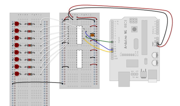 첫 번째 단계는 Arduino를 시프트 레지스터 하나로 확장하는 것입니다. 회로는 아래에 있으며 다음과 같이 연결합니다.