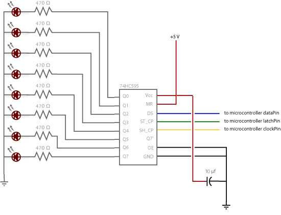 이 경우 각 LED의 캐소드(짧은 핀)를 공통 접지에 연결하고 각 LED의 애노드(긴 핀)를 해당 시프트 레지스터 출력 핀에 연결해야 합니다. 이와 같이 시프트 레지스터를 사용하여 전원을 공급하는 것을 소싱 전류라고 합니다. 일부 시프트 레지스터는 전류를 소싱할 수 없고 싱킹 전류라고 하는 작업만 할 수 있습니다. 이러한 레지스터 중 하나가 있는 경우 LED 방향을 뒤집어 애노드를 전원에 직접 연결하고 캐소드(접지 핀)를 시프트 레지스터 출력에 연결해야 합니다. 595 시리즈 칩을 사용하지 않는 경우 특정 데이터시트를 확인해야 합니다. LED가 과부하되지 않도록 470옴 저항을 직렬로 추가하는 것을 잊지 마세요.