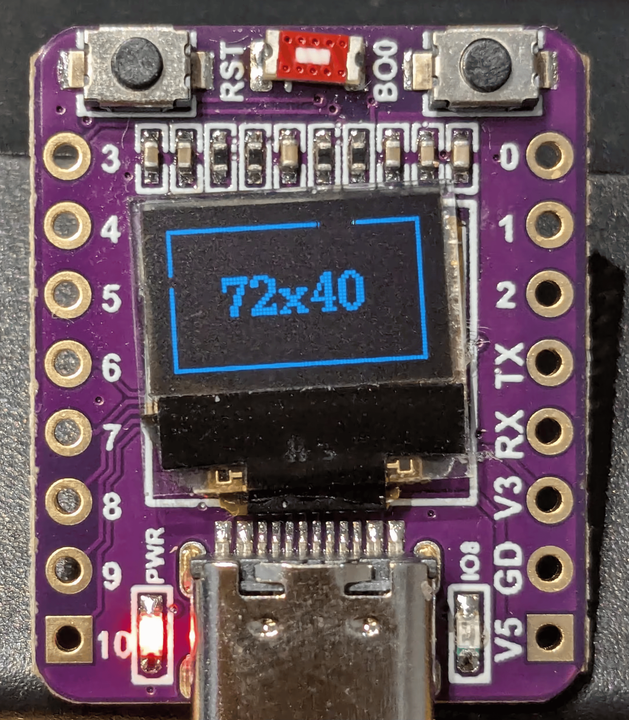 OLED는 실제로 조금 이상합니다. 작동하려면 약간의 트릭이 필요합니다. # 포함 # 포함 // U8g2 에는 72x40 생성자가 없으므로 72x40 화면이 SSD1306 컨트롤러의 132x64 픽셀 버퍼 중간에 매핑됩니다. U8G2_SSD1306_128X64_NONAME_F_HW_I2C u8g2(U8G2_R0, U8X8_PIN_NONE, 6, 5); Int 너비 = 72; Int 높이 = 40; Int xOffset = 30; // = (132-w)/2 Int yOffset = 12; // = (64-h)/2 Void 설정 (void) { 지연 (1000); U8g2. 시작 (); U8g2. setContrast(255); // 최대 대비 설정 U8g2. setBusClock(400000); // 400kHz I2C U8g2. setFont(u8g2_font_ncenB10_tr); } Void 루프 (void) { U8g2. clearBuffer(); // 내부 메모리를 지우십시오 U8g2. drawFrame(xOffset + 0, yOffset + 0, 너비, 높이); // 테두리 주위에 프레임을 그립니다. U8g2. setCursor(xOffset + 15, yOffset + 25); U8g2. printf("% dx % d", 너비, 높이); U8g2. sendBuffer(); // 디스플레이에 내부 메모리를 전송 }