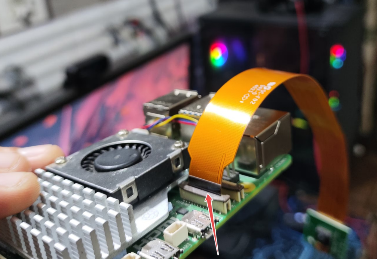 리본 커넥터의 색상이 있는 부분을 Raspberry Pi 5에 꽂습니다.