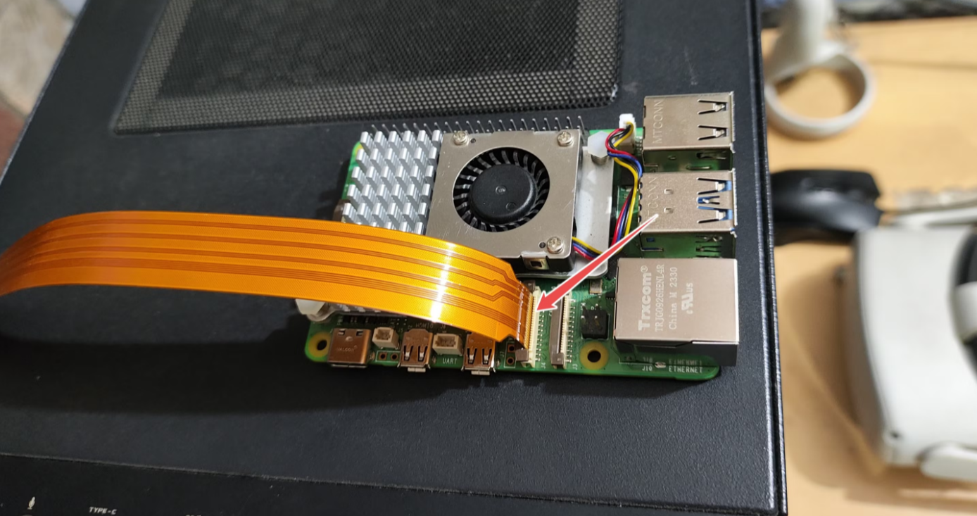 케이블이 카메라 모듈에 연결되었으므로 Raspberry Pi 5에 꽂을 수 있습니다.
