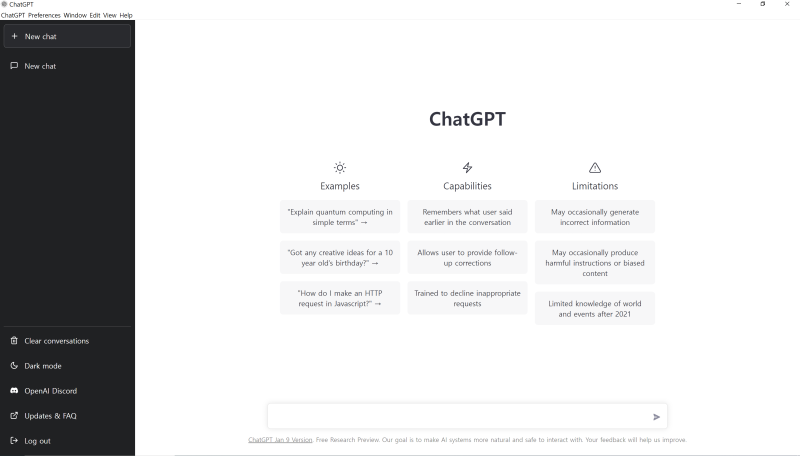 ChatGPT 사용자 인터페이스는 가능한 한 간단합니다. 메인 페이지와 왼쪽 사이드바가 있습니다.