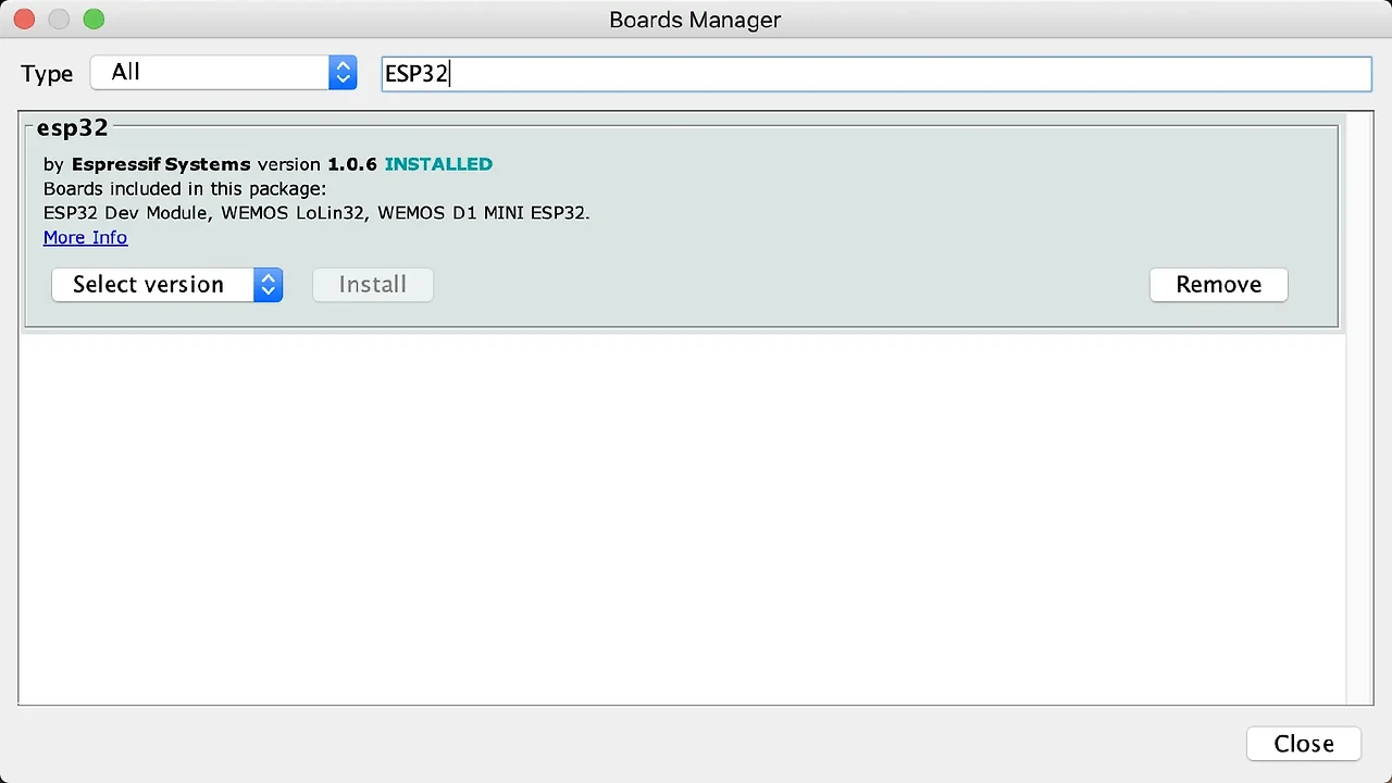 - 보드 관리자에서 "ESP32"를 검색합니다.