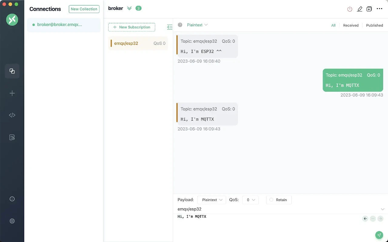 3. MQTTX 클라이언트를 사용하여 MQTT 브로커와 연결을 설정하고 ESP32에 Hi, I'm MQTTX와 같은 메시지를 게시합니다.