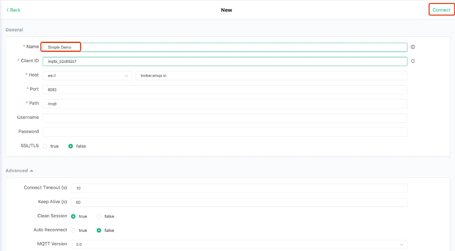 이름에 Simple Demo를 입력하고 오른쪽 상단 모서리에 있는 연결 버튼을 클릭하여 MQTT 연결을 만듭니다. 다음은 연결이 성공적으로 설정되었음을 나타냅니다.