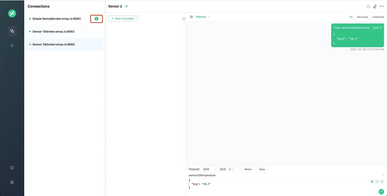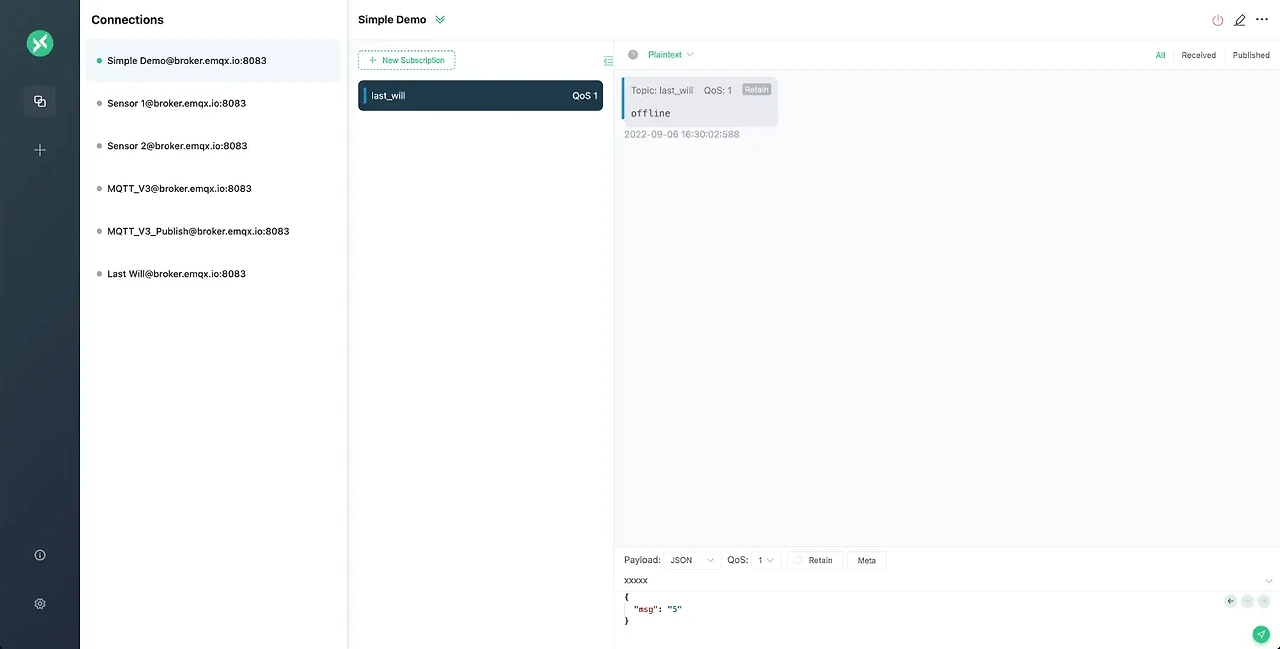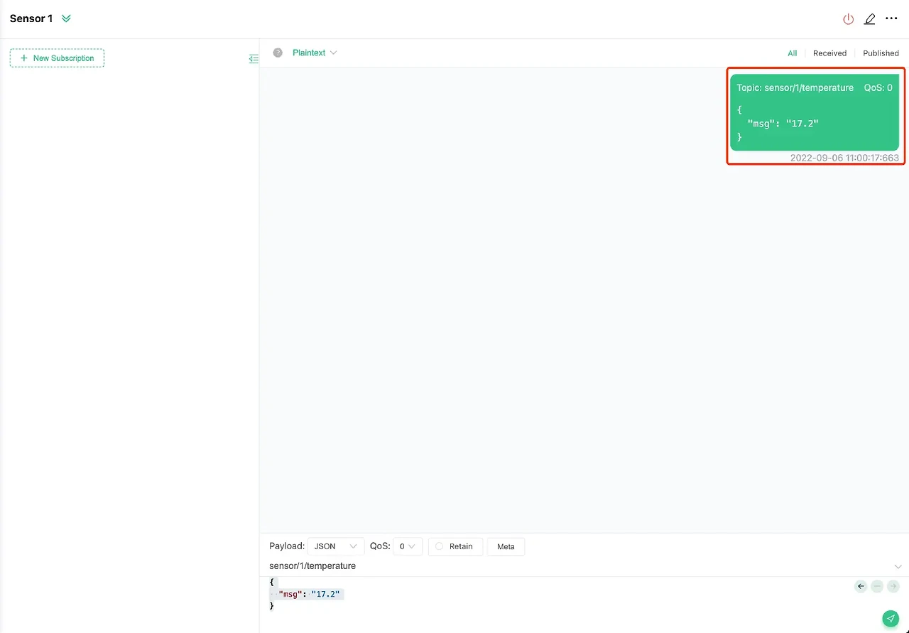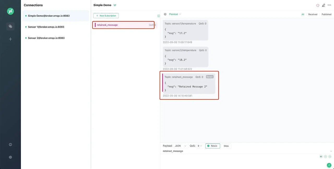 그런 다음 Simple Demo 연결의 retained_message 주제를 구독합니다. 구독이 성공하면 Sensor 1에서 보낸 두 번째 Retained Message가 수신되며, 이는 서버가 주제에 대한 마지막 Retained Message만 보관한다는 것을 보여줍니다.