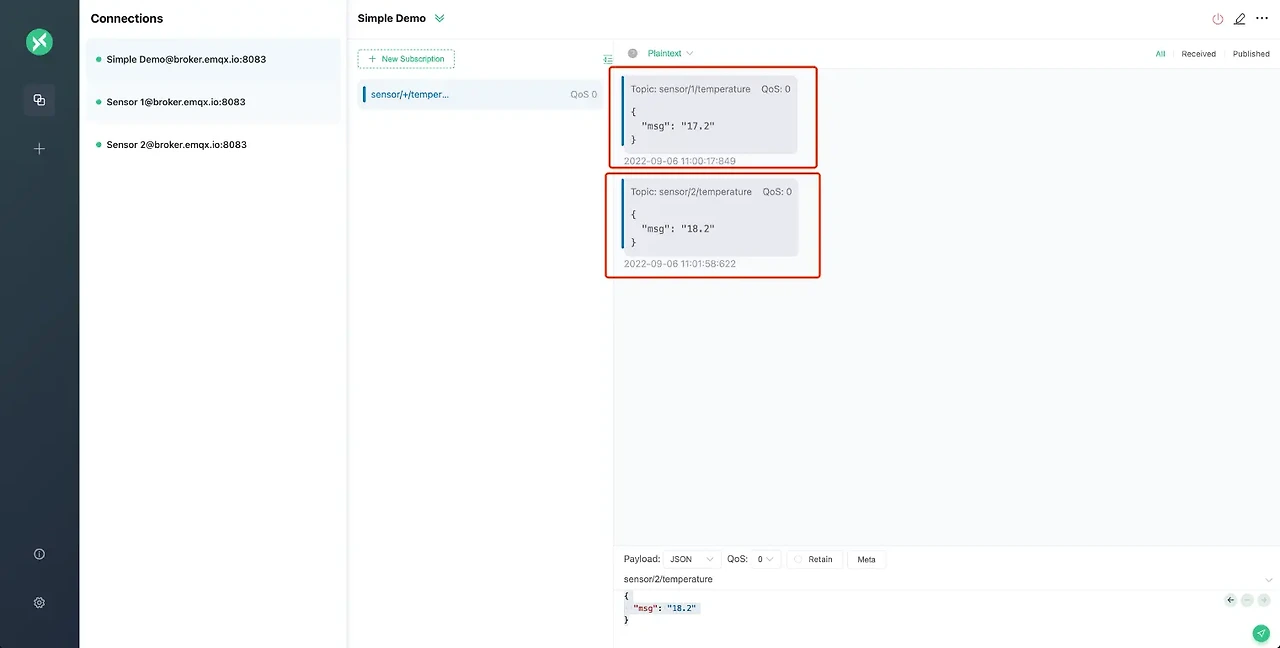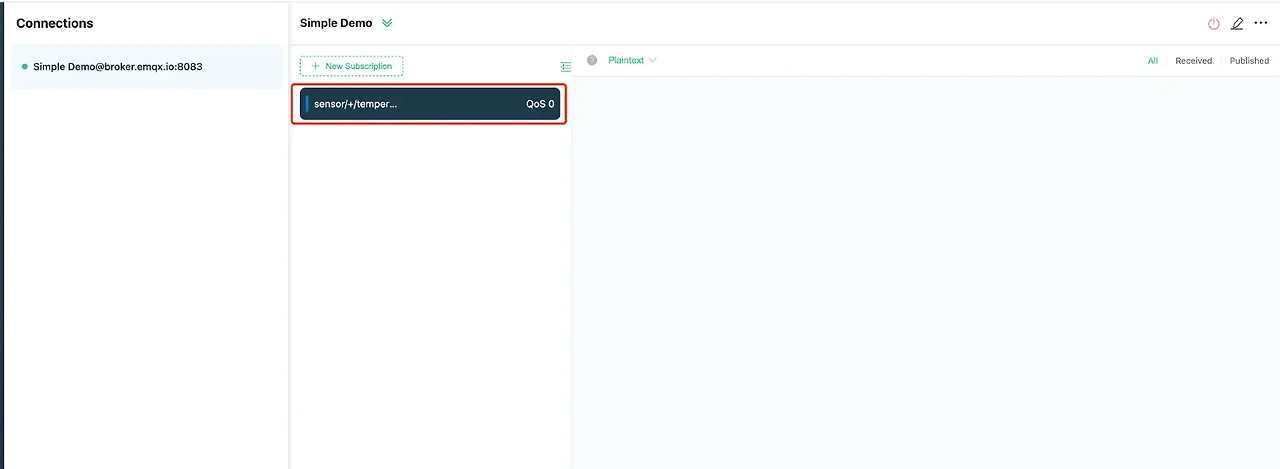 다음으로, 앞서 만든 Simple Demo 연결에서 와일드카드 토픽 sensor/+/temperature를 구독합니다. 이 토픽은 모든 센서에서 보고된 온도 데이터를 수신합니다.