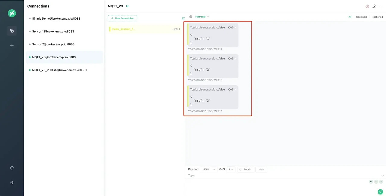그런 다음 MQTT_V3 연결을 선택하고 연결 버튼을 클릭하여 서버에 연결하면 세 개의 오프라인 메시지를 받게 됩니다.