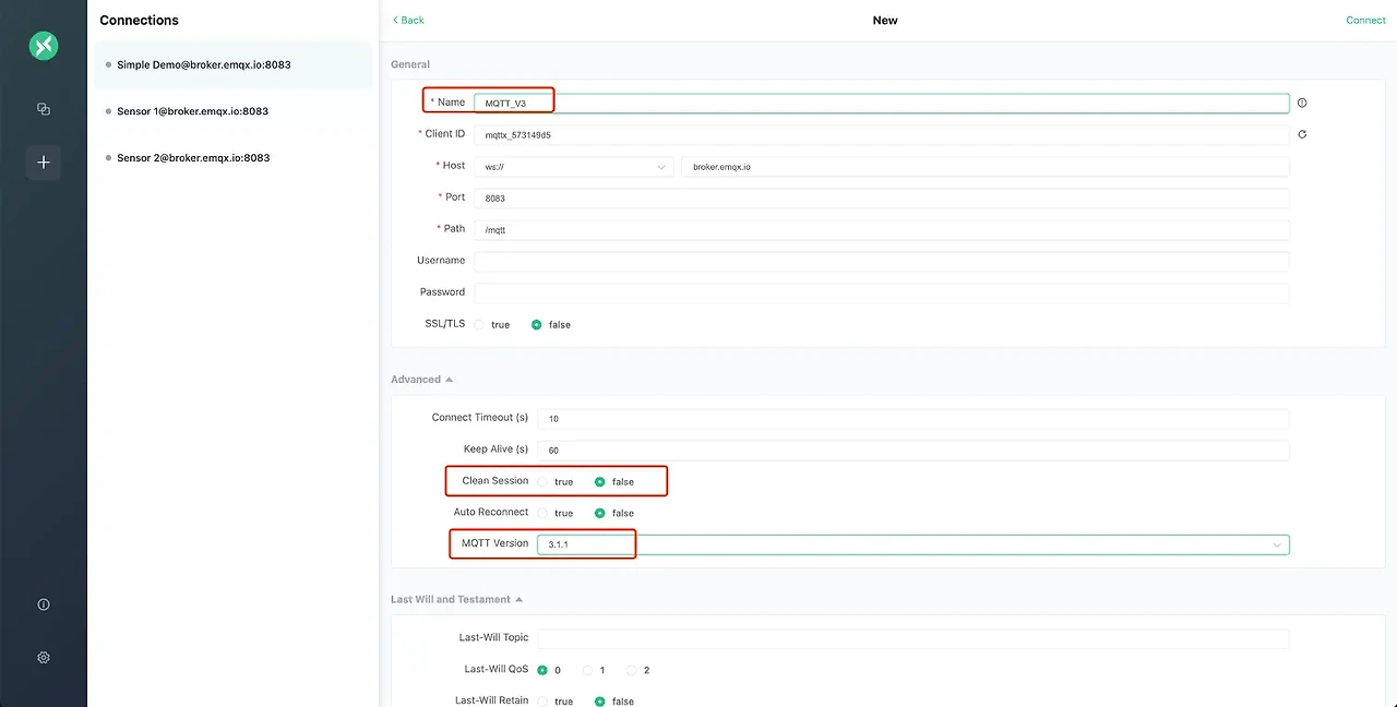 MQTT V3이라는 이름의 연결을 만들고 Clean Session을 false로 설정하고 MQTT 버전 3.1.1을 선택합니다.