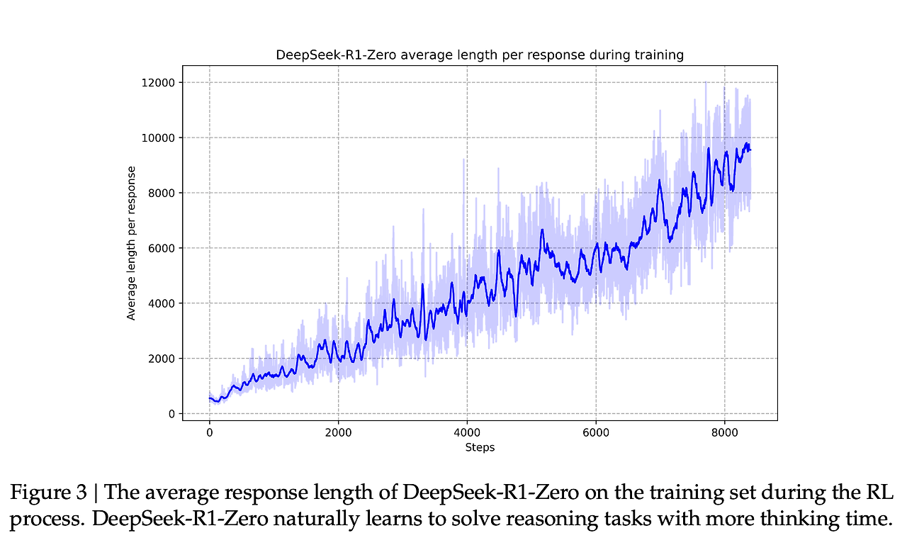 이 기능의 개선과 일치하는 것은 생성된 응답의 길이이며, 여기서 모델은 문제를 처리하기 위해 더 많은 사고 토큰을 생성합니다.