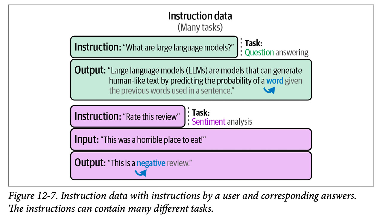 Supervised Fine-Tuning(SFT) 개념이 생소하다면, 이는 신속하고 정확한 완성의 형태로 모델에 훈련 예제를 제공하는 프로세스입니다. 12장의 이 그림은 몇 가지 SFT 훈련 사례를 보여줍니다.