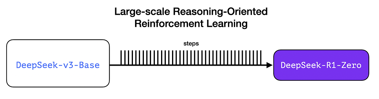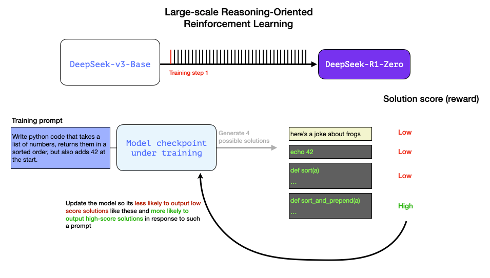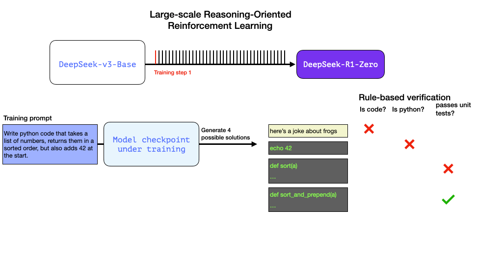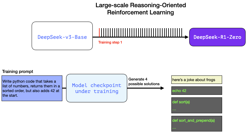 이 데이터는 추론을 전문으로 하는 이름 없는 형제인 R1의 전신에 의해 생성됩니다. 이 형제는 R1-Zero라는 세 번째 모델에서 영감을 받았습니다(곧 설명하겠습니다). 중요한 이유는 사용하기 좋은 LLM이기 때문이 아니라, 대규모 강화 학습과 함께 레이블이 지정된 데이터가 거의 필요하지 않아 추론 문제를 해결하는 데 뛰어난 모델이 만들어졌기 때문입니다.