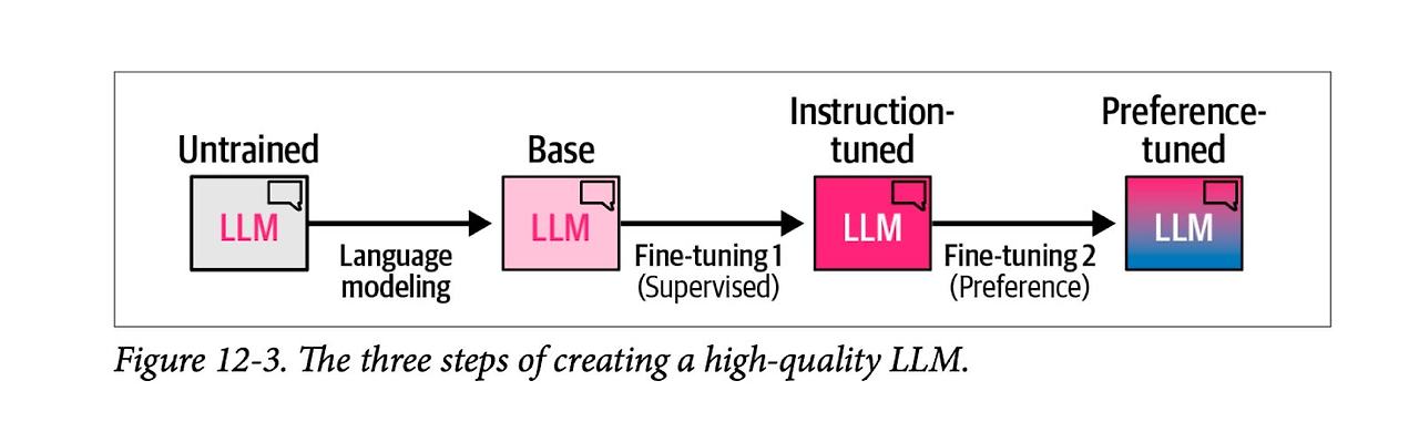 다음 그림은 저희 책의 12장에서 발췌한 것으로, 3단계에 걸쳐 고품질 LLM을 만드는 일반적인 레시피를 보여줍니다.