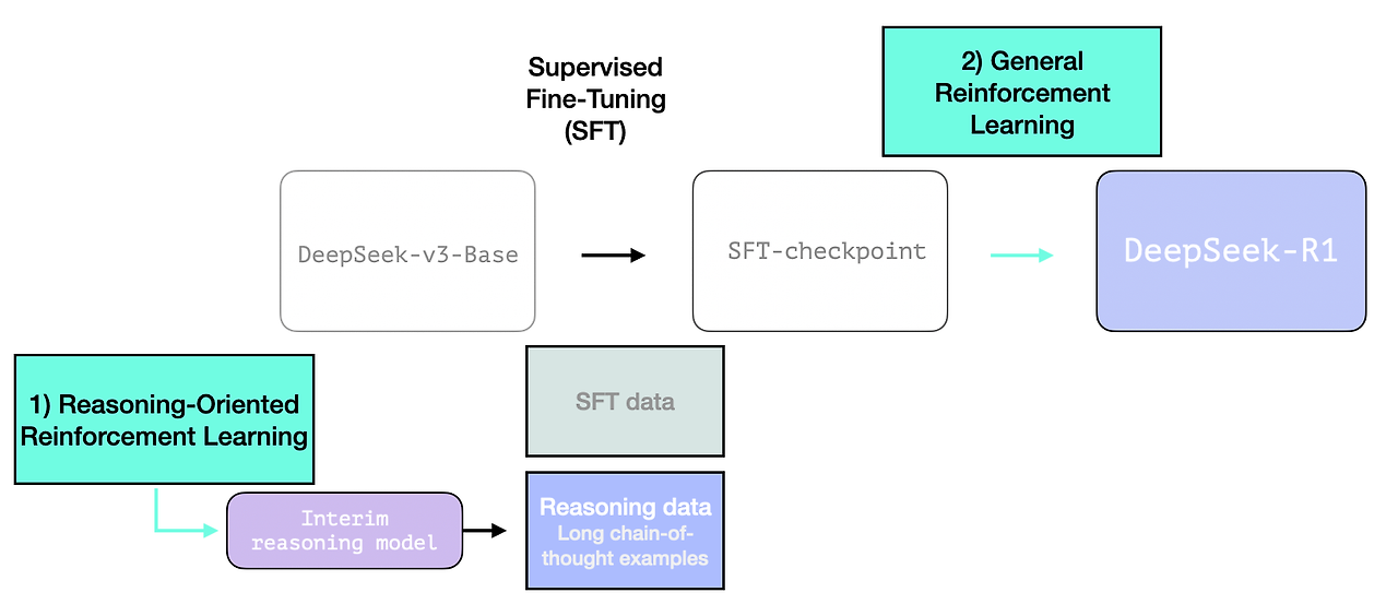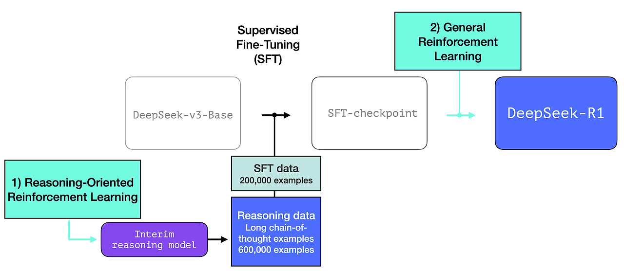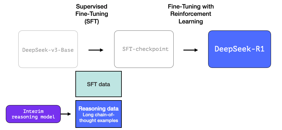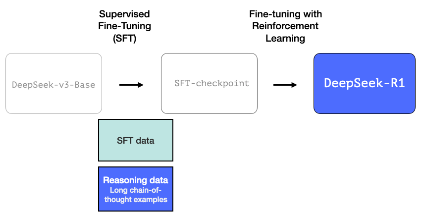 DeepSeek-R1은 이 일반적인 레시피를 따릅니다. 첫 번째 단계의 세부 정보는 DeepSeek-V3 모델에 대한 이전 논문에서 가져왔습니다. R1은 이전 논문의 기본 모델(최종 DeepSeek-v3 모델이 아님)을 사용하고 여전히 SFT 및 선호도 튜닝 단계를 거치지만, 이를 수행하는 방법에 대한 세부 사항이 다릅니다.
