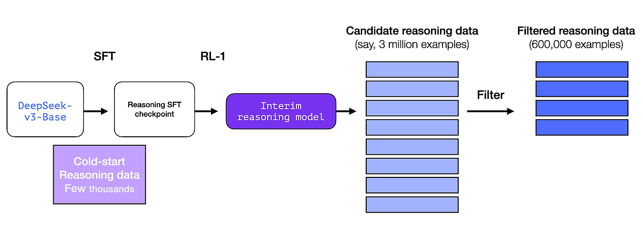 하지만 잠깐만요, 이 데이터가 있다면 왜 RL 프로세스에 의존하는 걸까요? 데이터의 규모 때문입니다. 이 데이터 세트는 5,000개의 예제일 수 있지만(소싱 가능), R1을 훈련하려면 600,000개의 예제가 필요했습니다. 이 중간 모델은 그 격차를 메우고 매우 귀중한 데이터를 합성적으로 생성할 수 있도록 합니다.