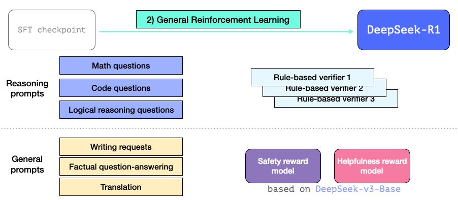 이를 통해 R1은 추론 및 기타 비추론 작업에서 탁월해질 수 있습니다. 이 프로세스는 이전에 본 RL 프로세스와 유사합니다. 하지만 비추론 애플리케이션으로 확장되므로 이러한 애플리케이션에 속하는 프롬프트에 대해 유용성 및 안전 보상 모델(라마 모델과 다름없음)을 활용합니다.