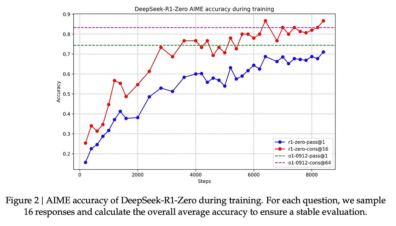 R1-Zero는 레이블이 지정된 SFT 학습 세트 없이도 추론 작업에서 탁월할 수 있기 때문에 특별합니다. 그 훈련은 사전 훈련된 기본 모델에서 RL 훈련 프로세스(SFT 단계 없음)를 거쳐 직접 진행됩니다. 이 과정은 o1과 경쟁할 만큼 잘 진행됩니다.